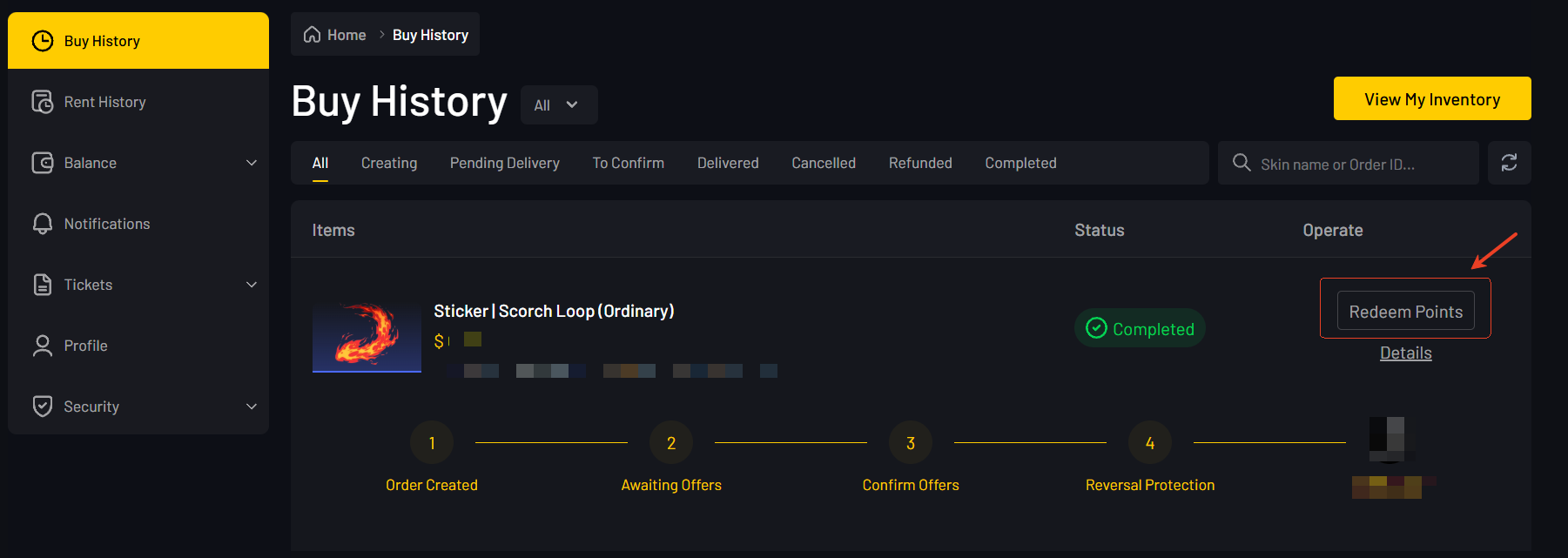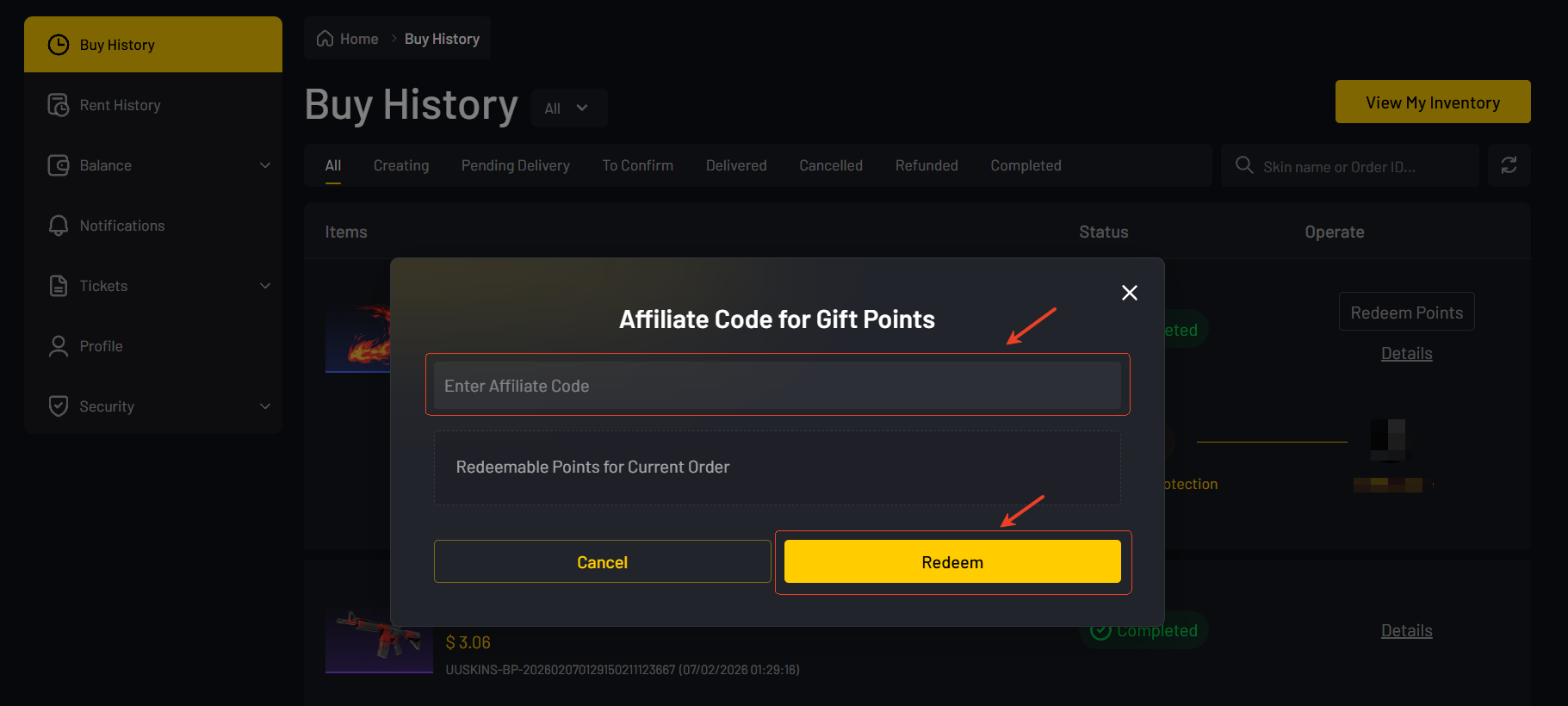 • Buy Any CS2 Skin - After each completed order, the corresponding base Gift Points will be automatically issued to your account balance, without any manual redemption required.